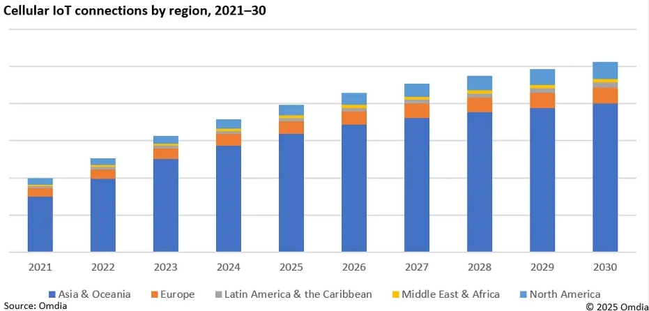C114讯 7月21日消息(艾斯)根据市场研究公司Omdia的最新研究,并彰显了该地区在联网设备生态系统中的技术领导地位。蜂窝物联网市场在未来六年将迎来显著扩张,